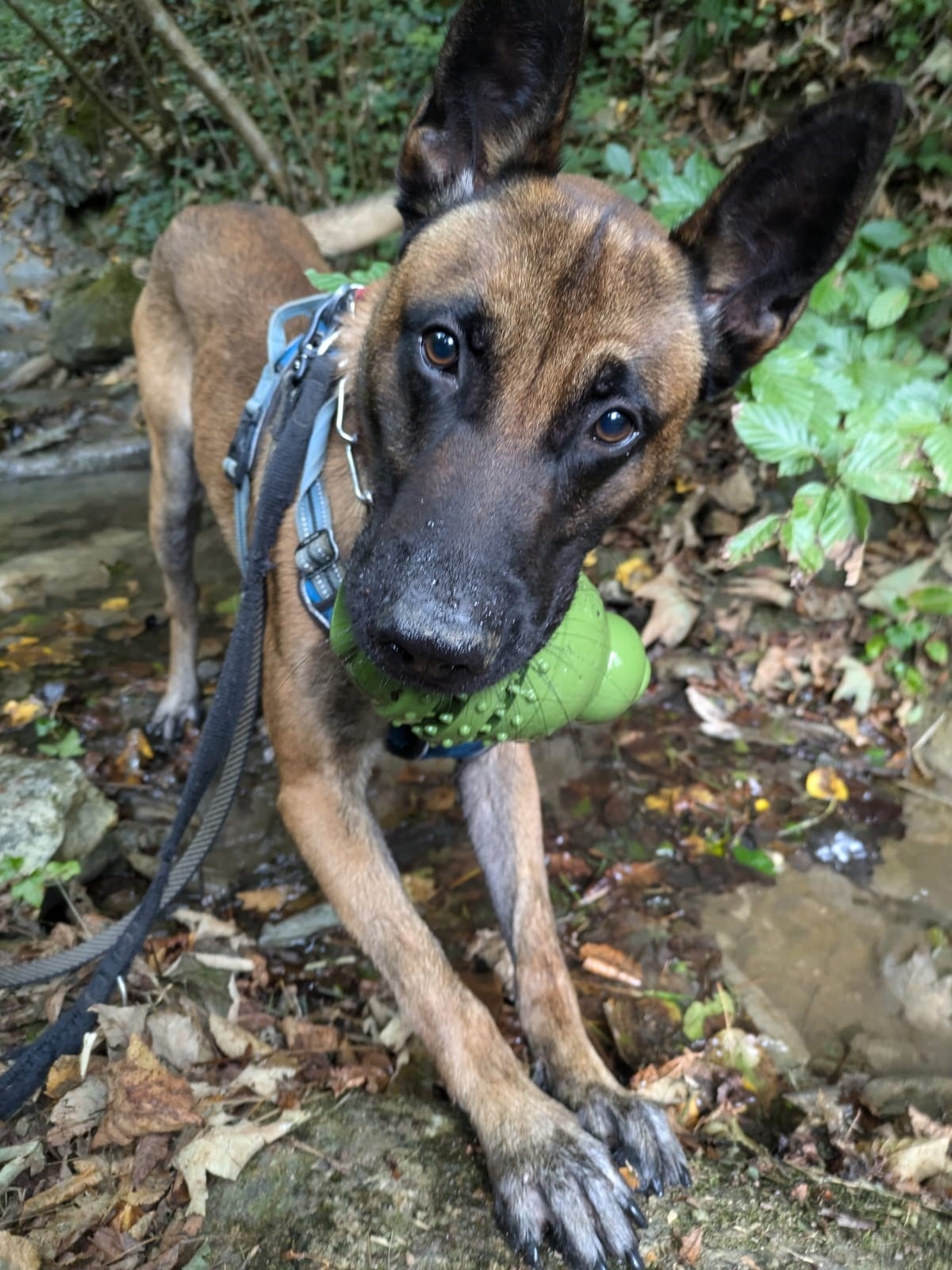 Entente congénères : il s’entend très bien avec certains chiens, notamment celui de l’éducatrice qui le suit, bien codé et capable de désamorcer les débuts de conflit. Un(e) congénère sociable et équilibré(e) pourra être un bon compagnon, surtout si l’humain sait instaurer un lien et réguler les interactions.