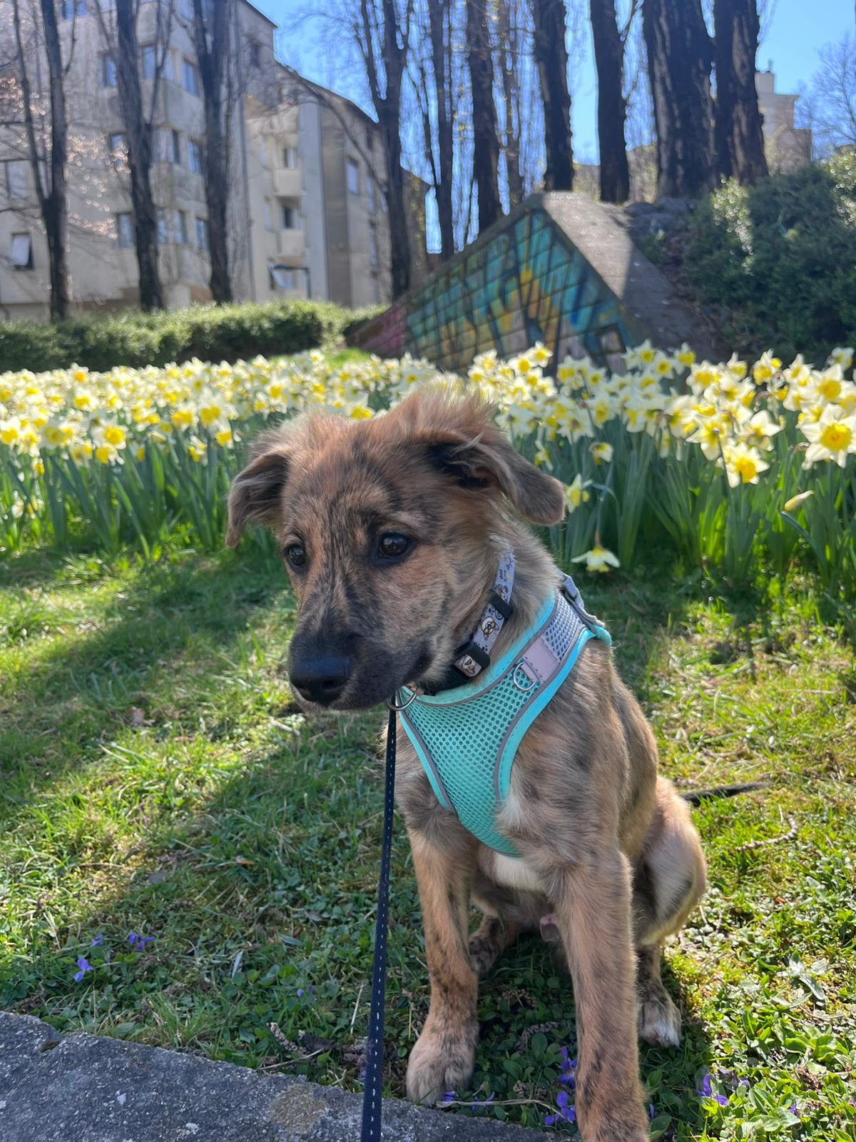 En promenade, Baiko a encore tendance à marcher derrière, mais il progresse de jour en jour et commence à être plus à l’aise en laisse et ose aller vers l’avant.