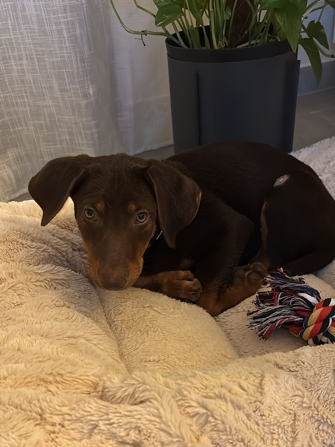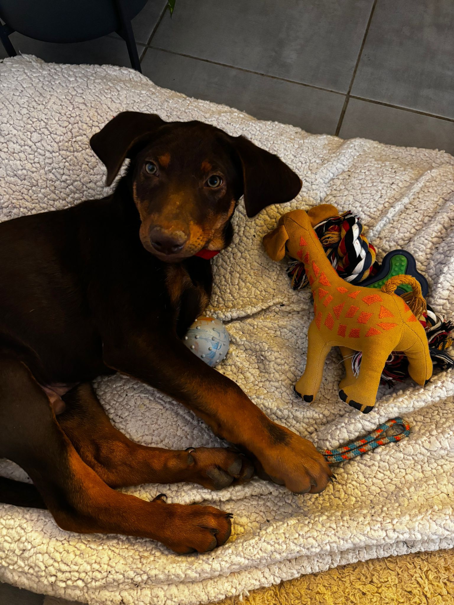 Banco apprend vite. Les bases (assis, couché, “non”) sont en cours d’acquisition, tout comme la propreté. Il progresse chaque jour et sait déjà signaler quand il a besoin de sortir. Il aura simplement besoin d’un cadre et de cohérence pour continuer à évoluer sereinement.