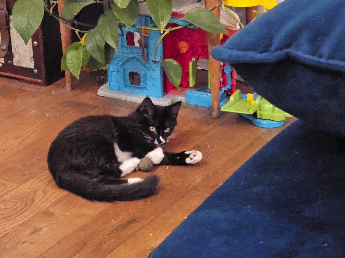 Cabotin est un petit chat très joueur avec son frère, mais encore très timide avec les humains. Les caresses ne sont possibles que lorsqu’il mange ou qu’il est blotti contre sa maman ou son frère dans un coin. Sinon, il préfère rester discret et retourner auprès de sa mère
