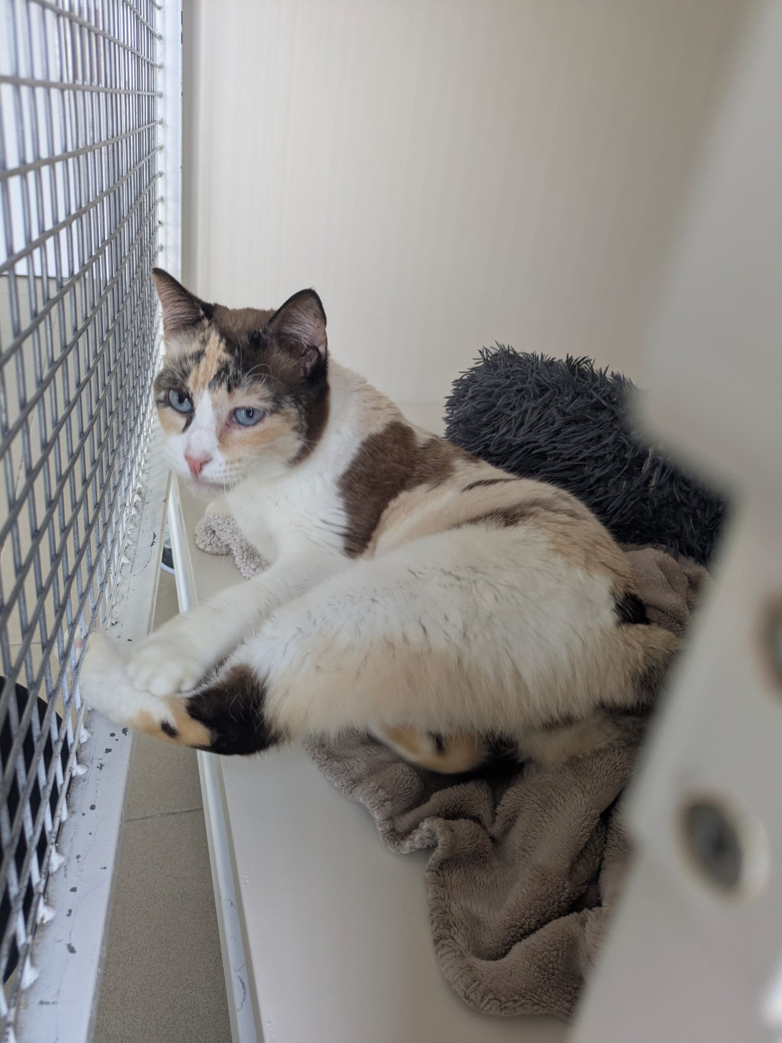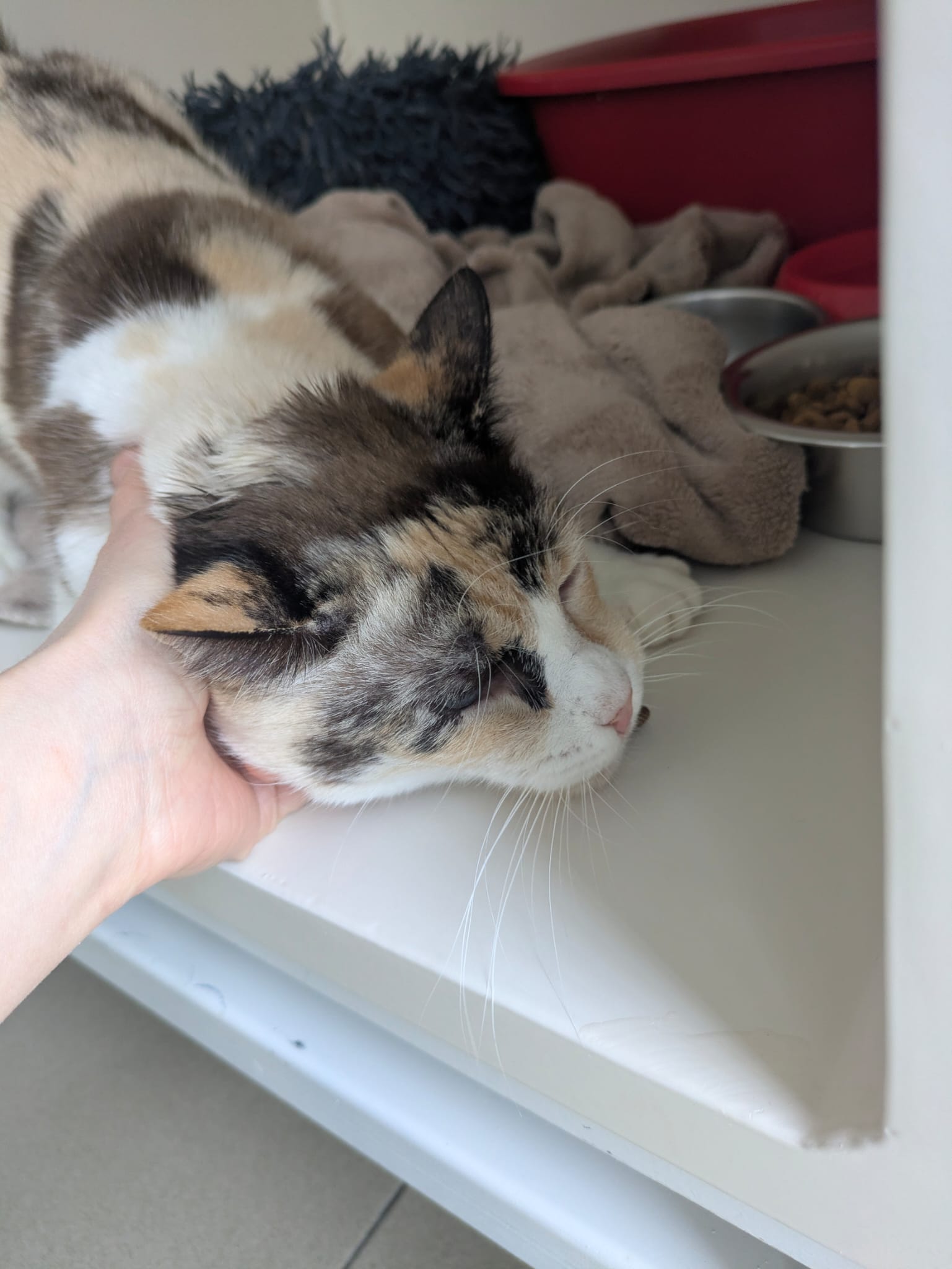 Voici Emraude, une minette marocaine arrivée il y a peu de temps. Une dame les a récupérés dans la rue lorsqu’ils étaient chatons et ne pouvait malheureusement plus s’en occuper. Ils ont tous les quatre une gingivite mais cela ne les empêche pas du tout de manger.