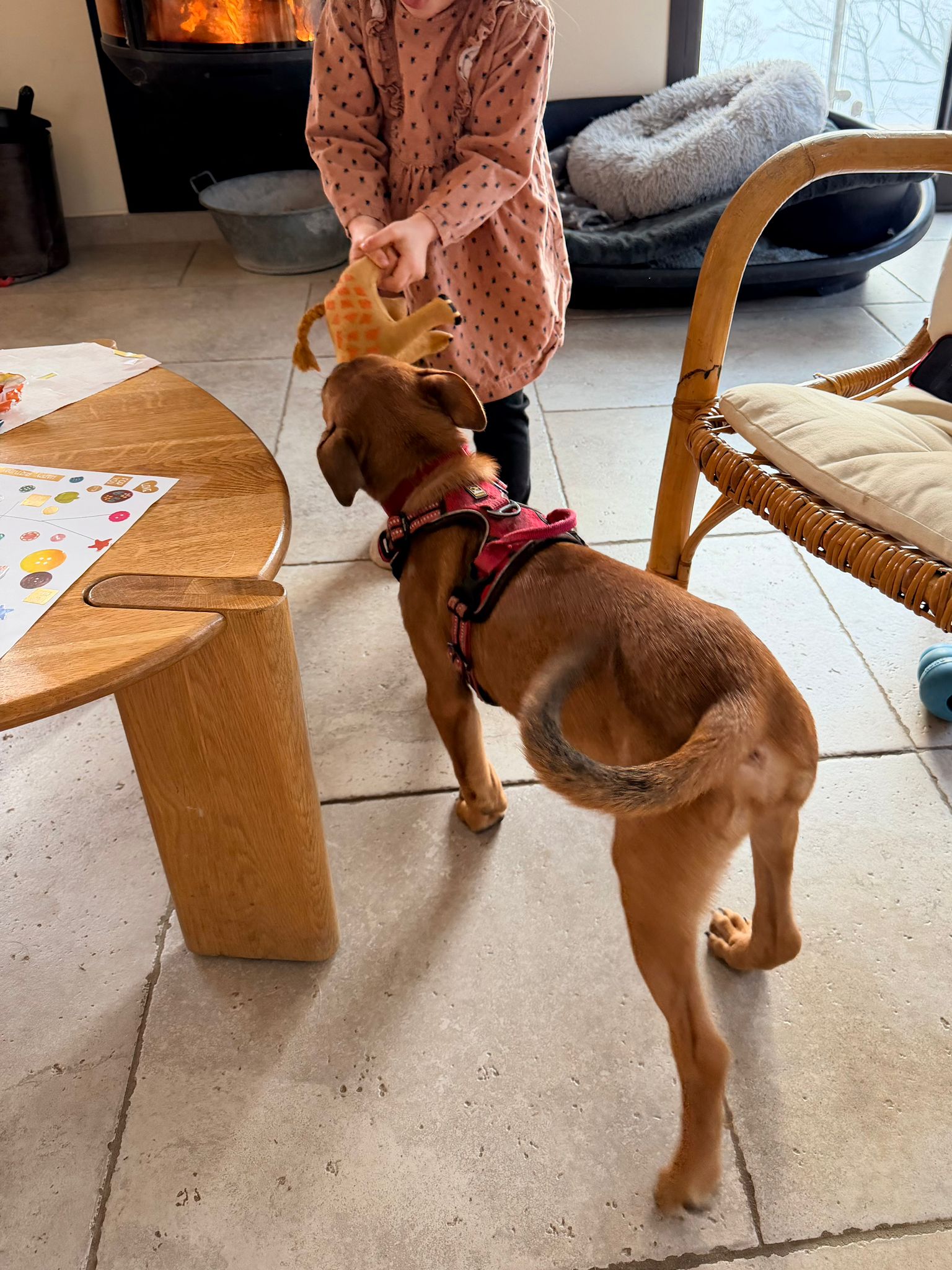 Il a déjà appris à rester seul et, lorsqu’il a été suffisamment dépensé avant, il ne fait pas de bêtises et se repose tranquillement. Everest adore jouer avec les enfants et partage volontiers ses moments de jeu et de câlins avec eux.