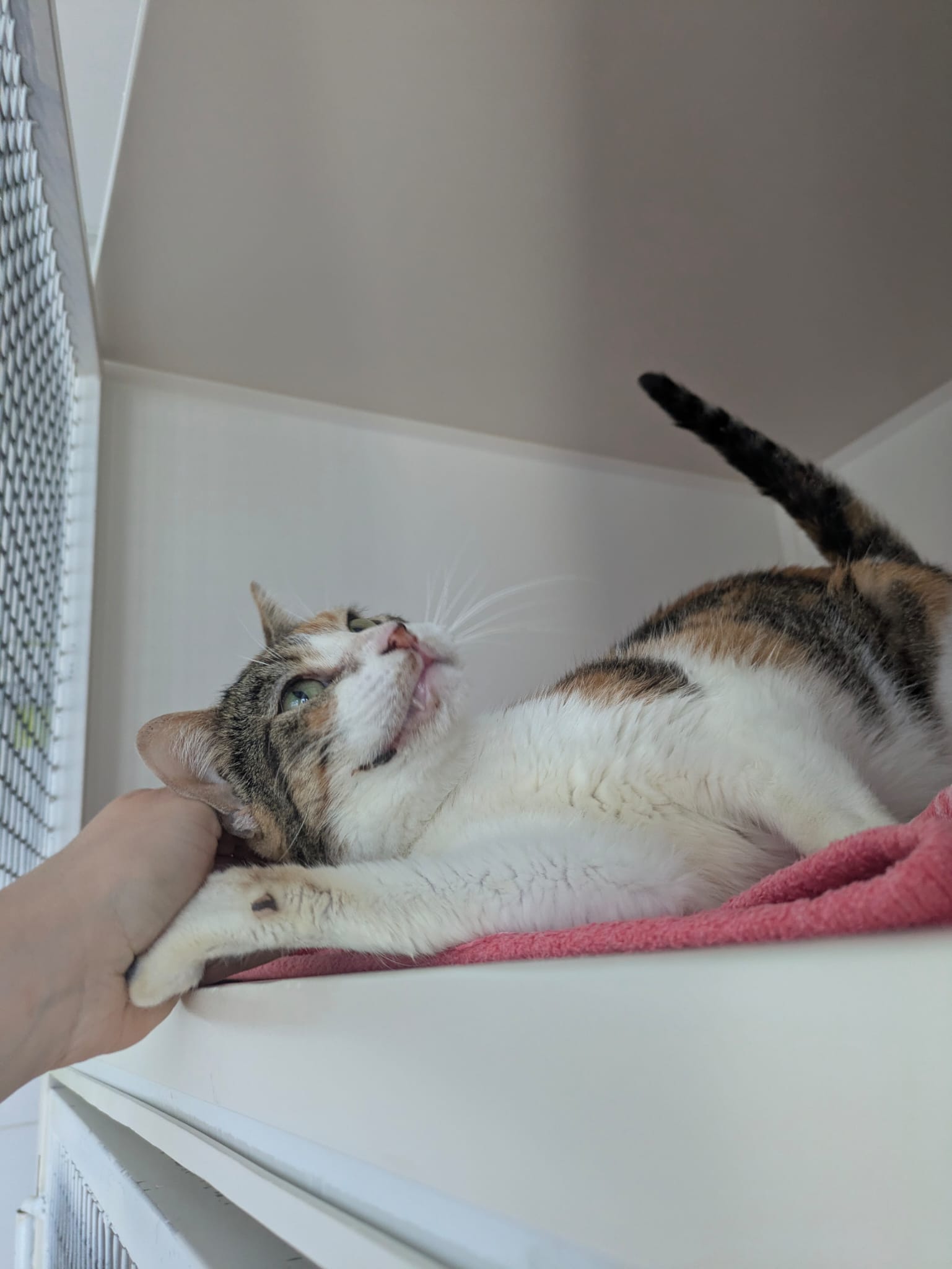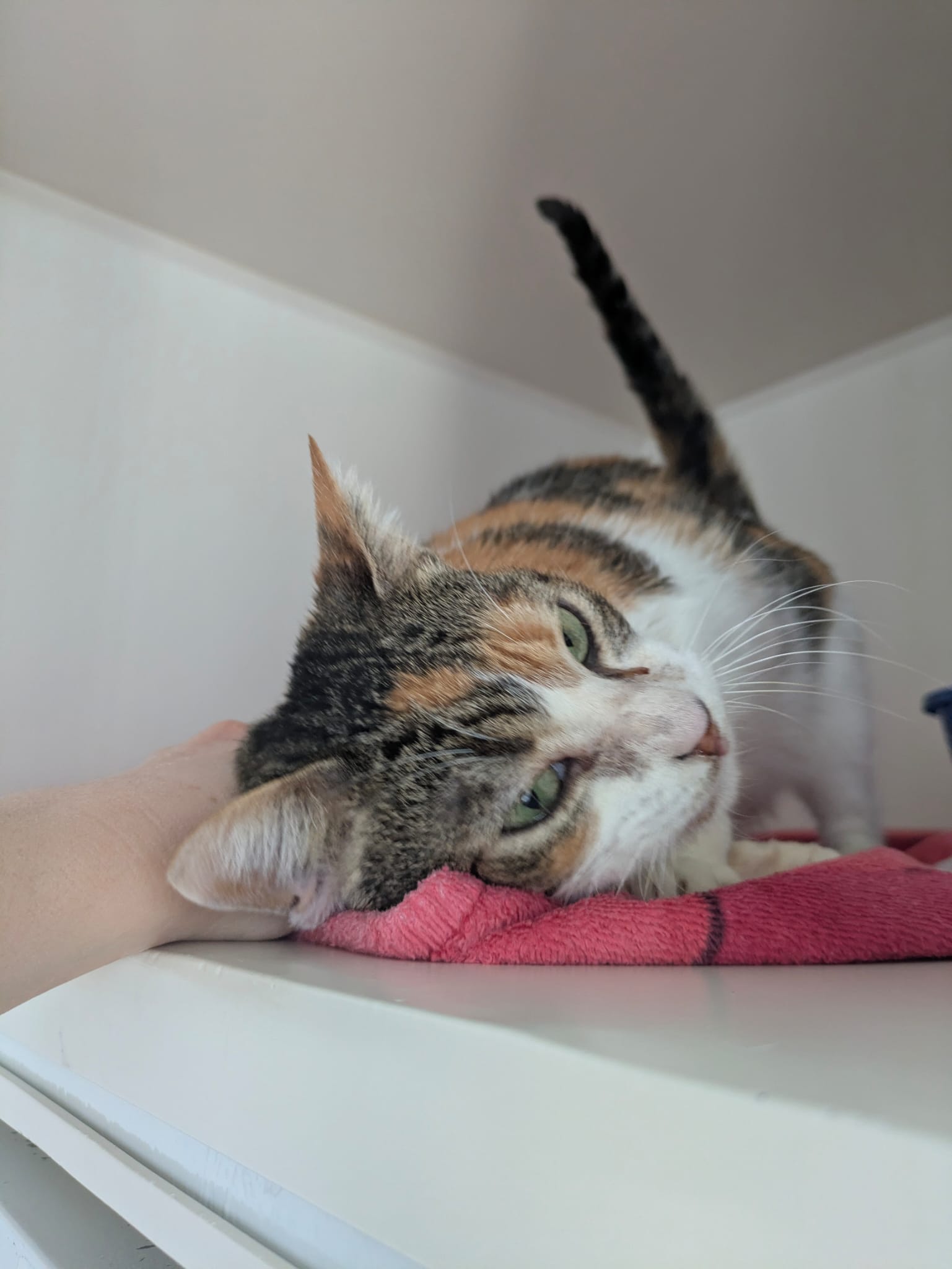Hbiba réclame beaucoup l’attention des humains (elle patoune énormément !). C’est une gentille chatte qui attend impatiemment sa nouvelle famille.