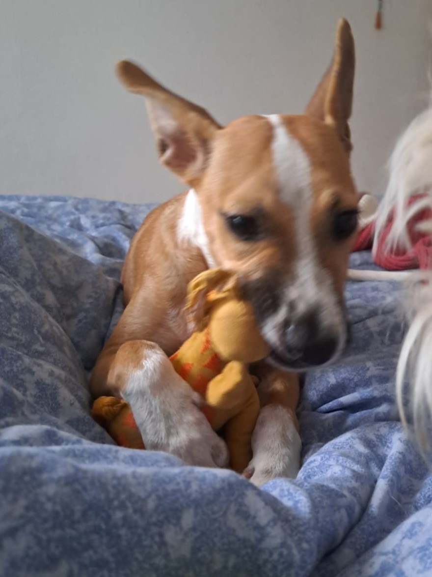 C’est une super pepette, rigolote, joueuse, mais capable d’être parfaitement calme à l’intérieur. Elle peut parfois embarquer une chaussette, mais un simple “non” suffit pour qu’elle la repose, une vraie petite maline ! Elle adore tous les jouets, qu’elle partage volontiers avec ses copains.