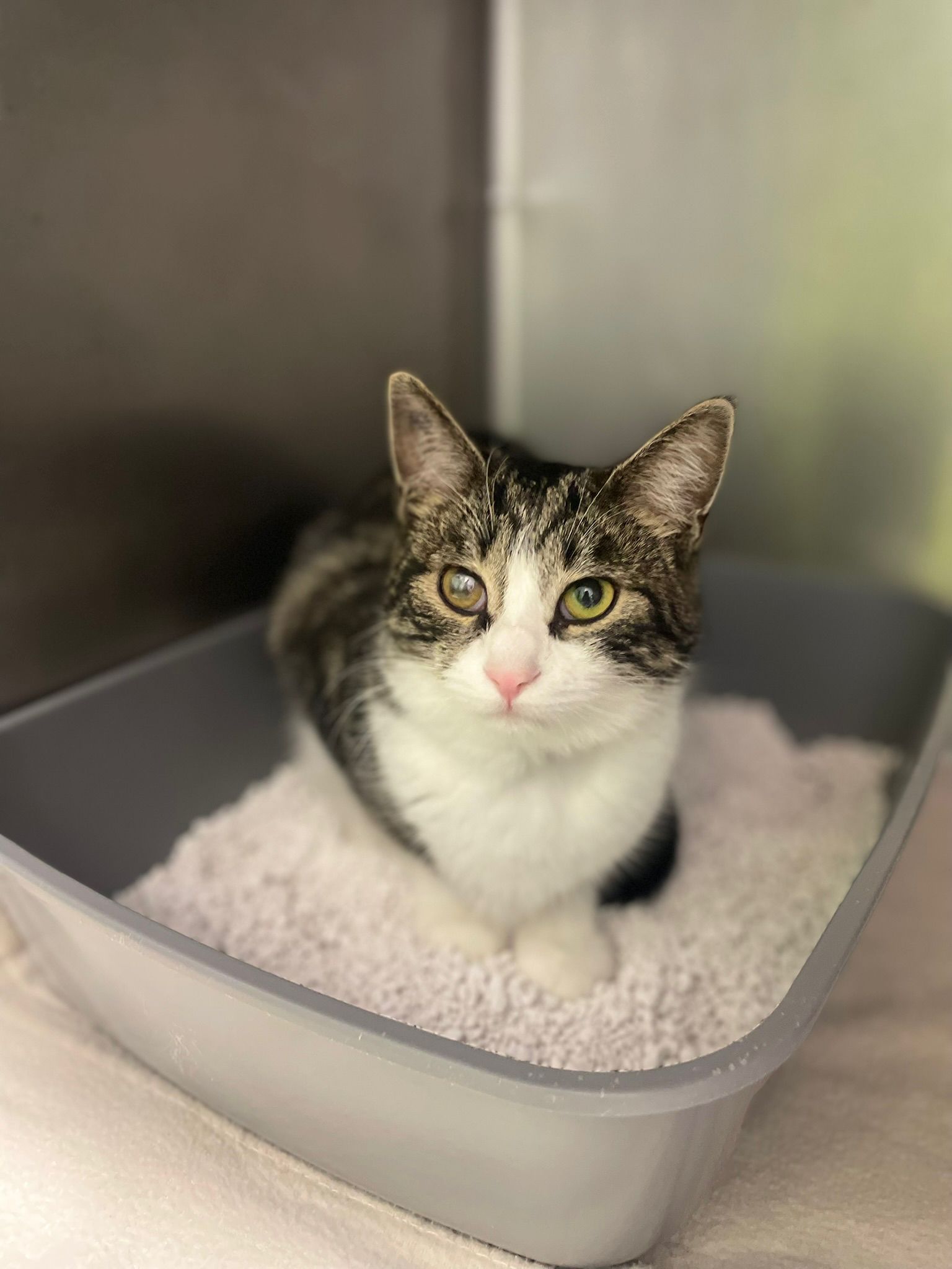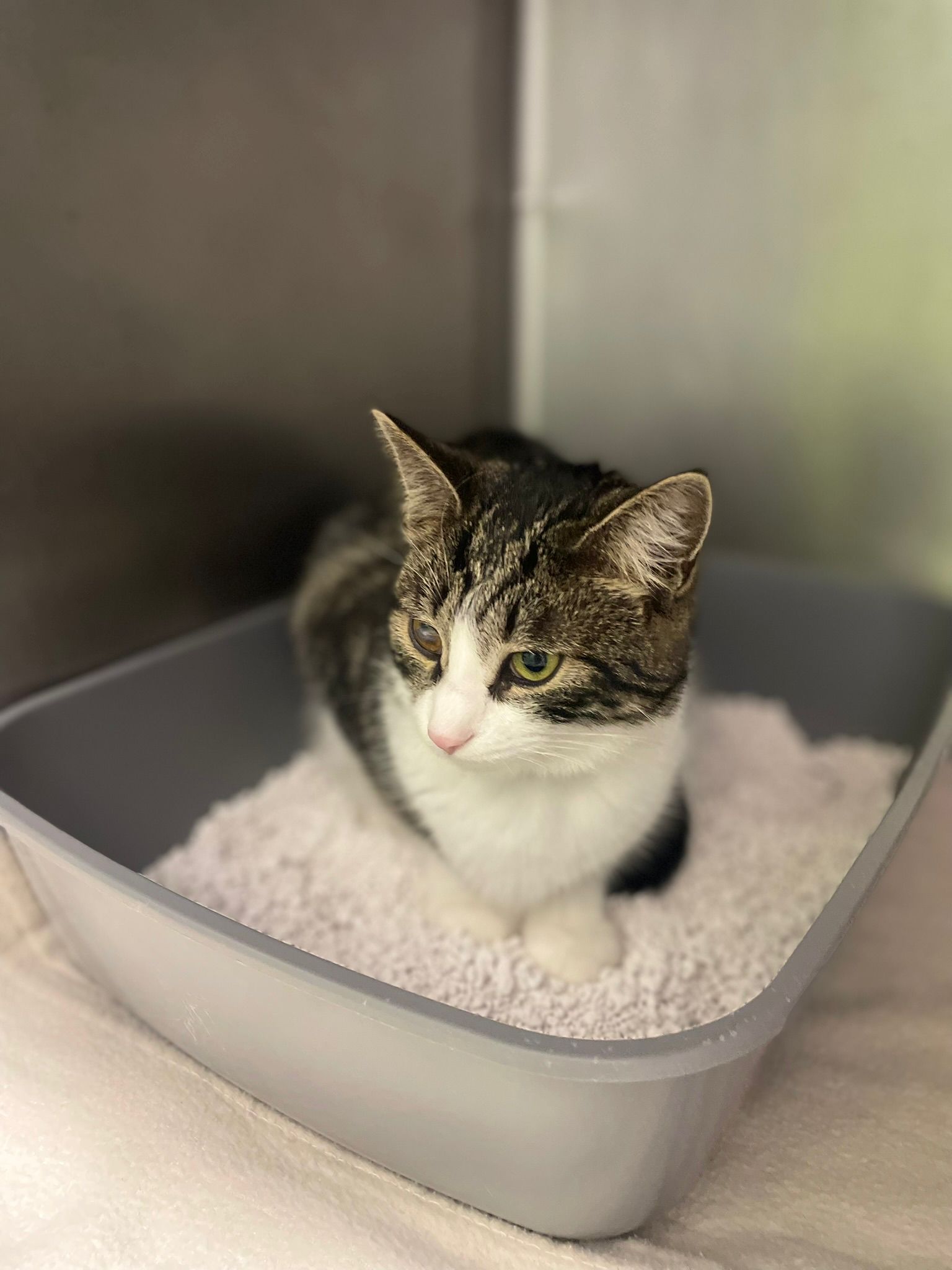 Pour le moment, c’est une jeune chatte encore craintive et impressionnée par l’humain. Elle observe beaucoup son environnement et a besoin de temps pour comprendre qu’elle peut faire confiance.