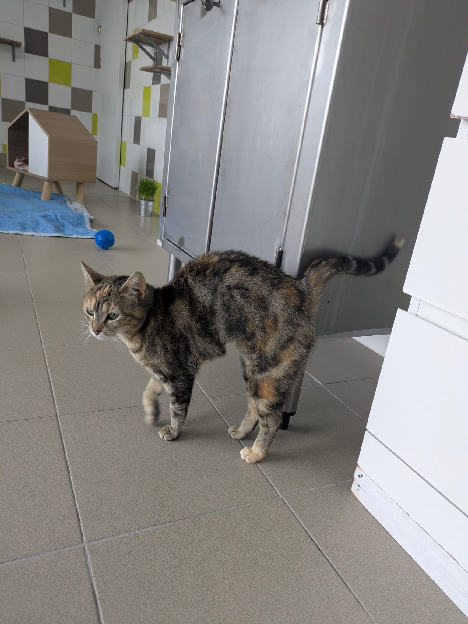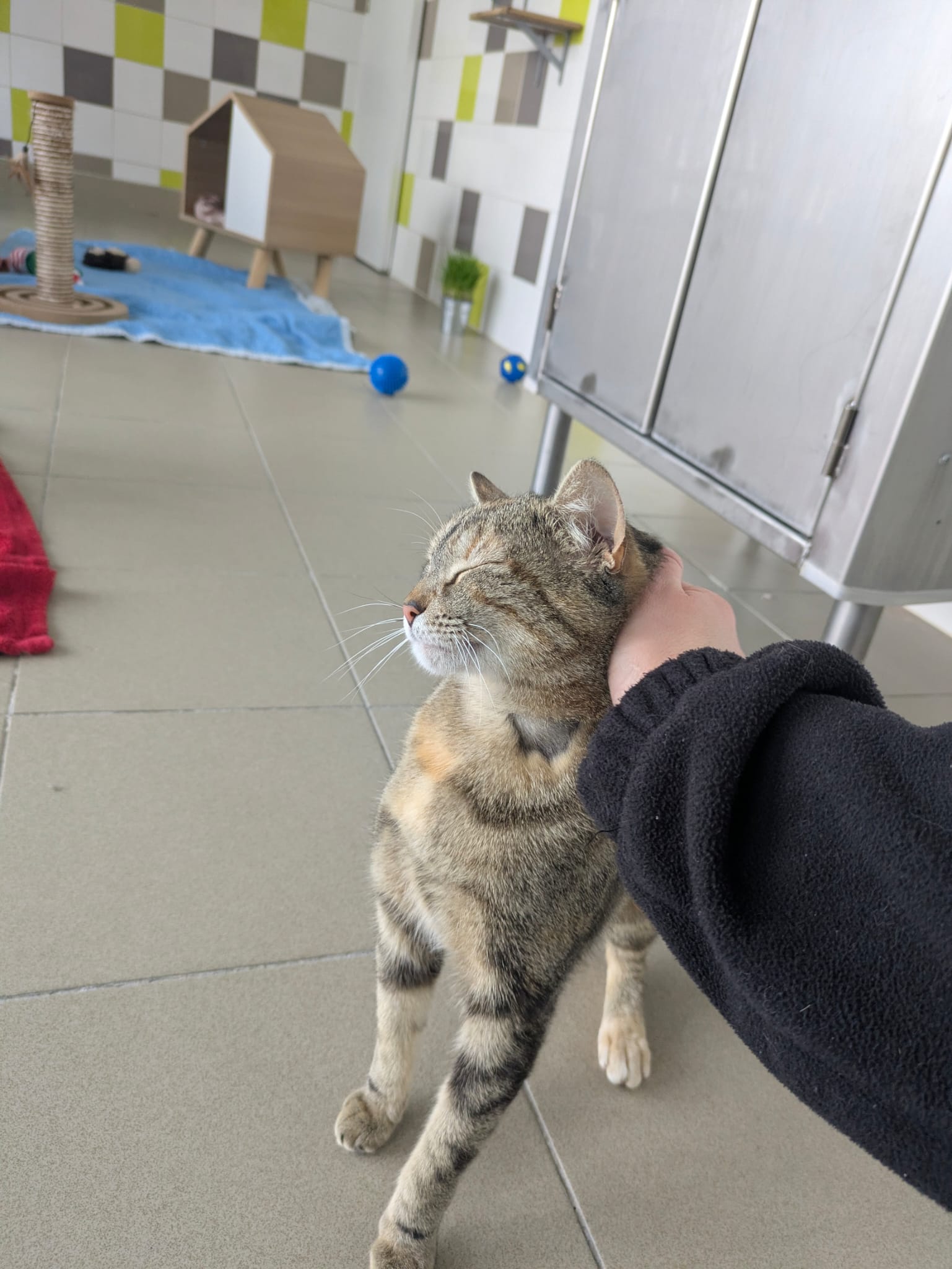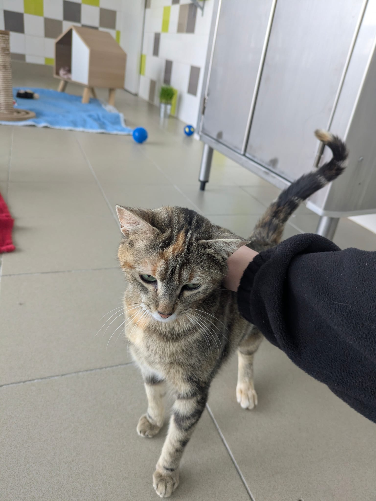 Pokita est une jeune mimine de la rue qui essayait de trouver refuge chez une famille. Au début apeurée, elle accorde sa confiance à ceux qui lui laissent le temps de s’approcher. Elle a peur des gestes brusques et du bruit, mais si on s’assoit calmement (parfois avec un peu de pâtée… C’est une gourmande !) elle vient prudemment, et… se rend compte qu’elle adore se faire caresser ! Elle sera tout de même placée dans un foyer calme (sans jeunes enfants), et impérativement en maison. Elle s’entend bien avec les chats à condition que l’autre congénère ne soit pas trop oppressant envers elle.