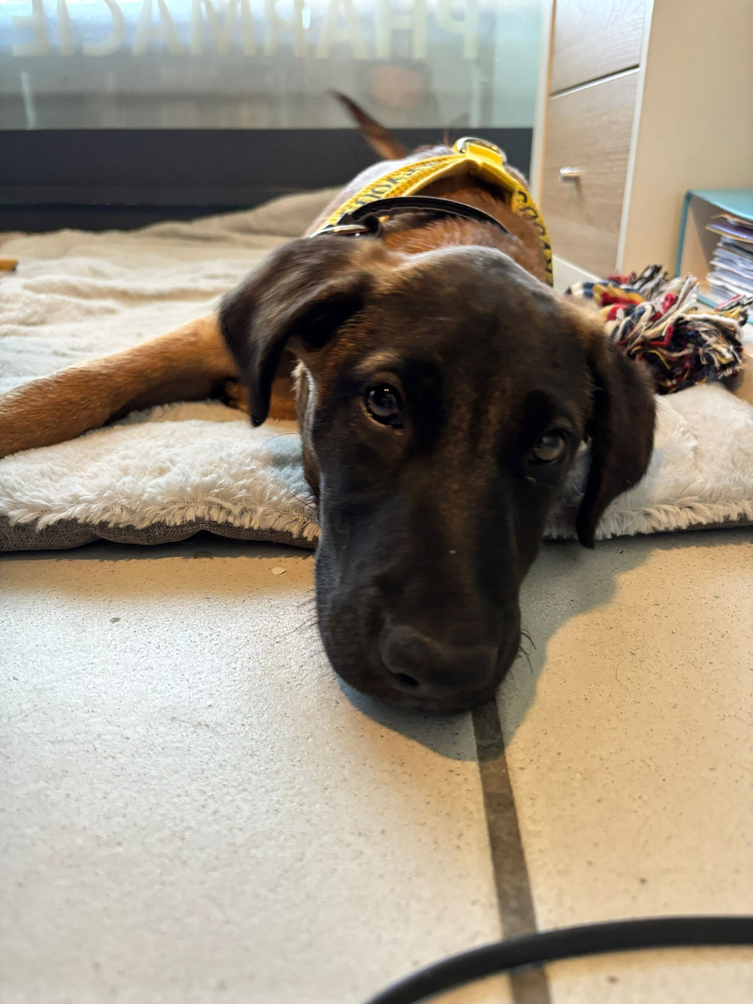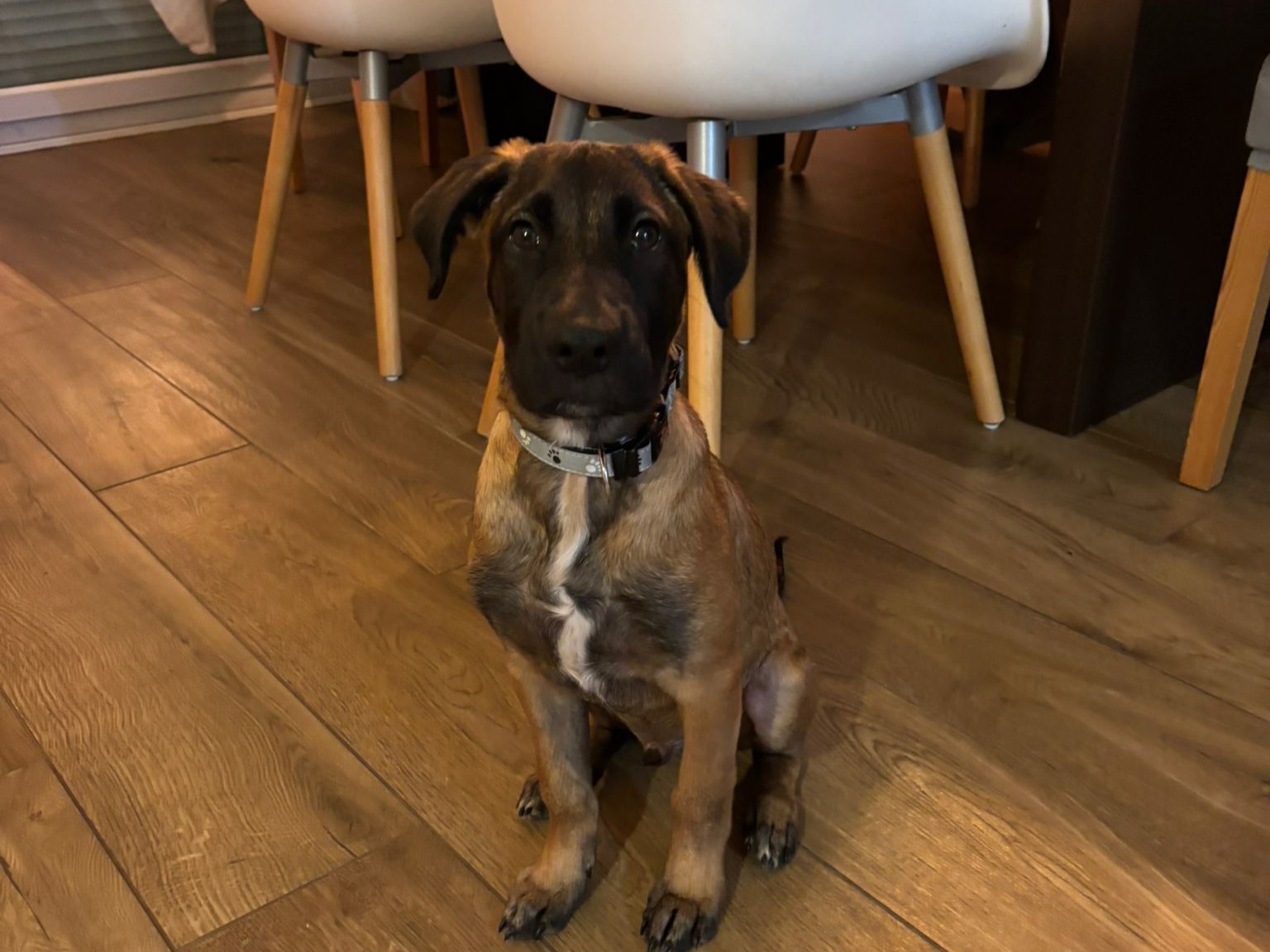 Malgré son petit air parfois tristounet, c’est un chiot plein de joie de vivre, curieux et attachant.