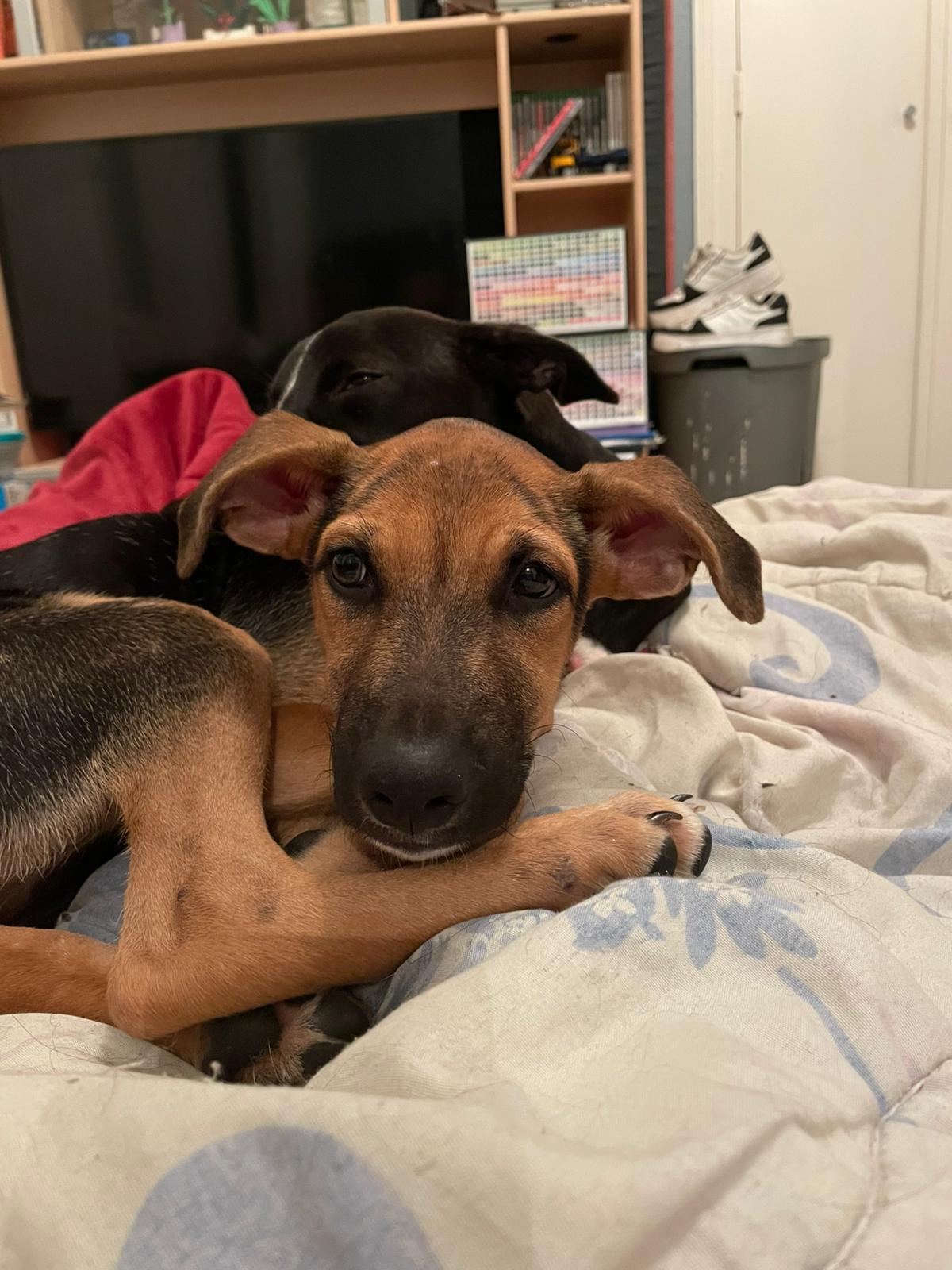 Pour le moment, il n’est pas possible de la laisser seule, car elle aboie beaucoup, et elle n’a pas encore acquis la propreté, mais c’est en cours d’apprentissage et elle fait de beaux progrès.