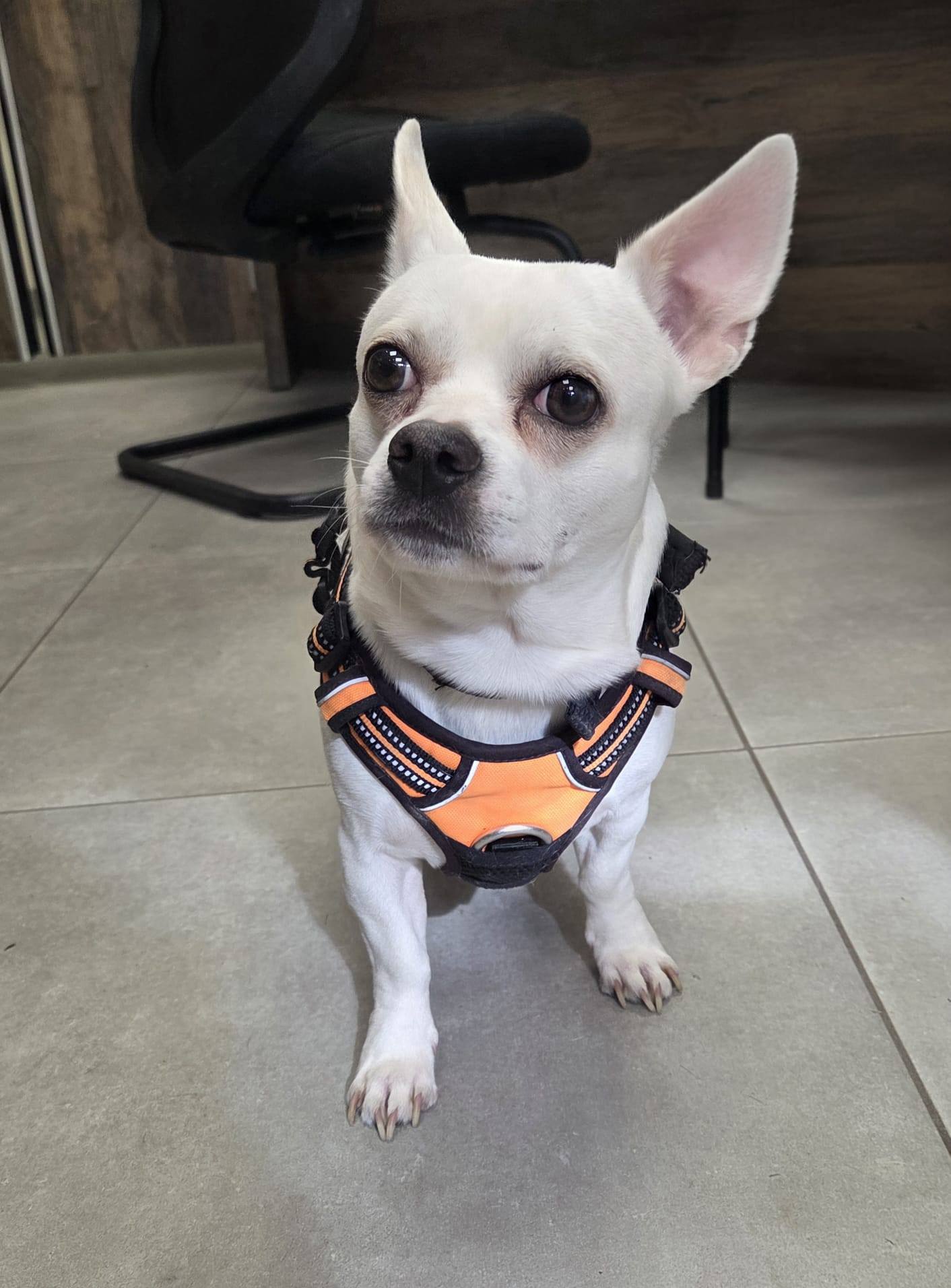 Togo est un petit chien de type Chihuahua, né en octobre 2022, arrivé récemment au refuge. Il pèse environ 8 kg, un léger rééquilibrage alimentaire sera à prévoir pour l’aider à retrouver son poids de forme.